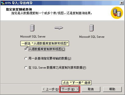 | 5. 选择复制方式,一般选“从源数据库复制表和视图”,点“下一步”继续 | |