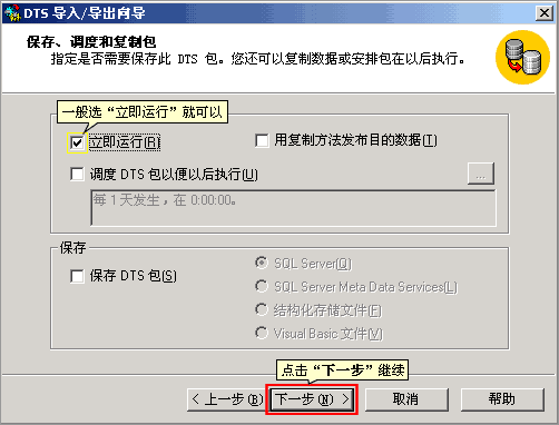 | 7. 设定调度方式,一般选“立即运行”就可以,然后点“下一步”继续 | |