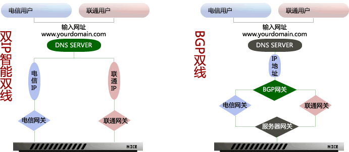 双IP智能双线需要设置两个IP地址,最佳访问路由是由域名DNS服务器根据访问者的登陆IP来确定的。 相比双IP智能解析,BGP双线服务器在骨干路由决定最佳路由时,有可能由于网间路由跳转次数比较多,访问的速度比双IP智能双线慢一点;而双IP智能双线由于是软件决定,有可能由于软件数据库不完整或者IP数据的变更造成的自动识别错误。 总之BGP双线与双IP智能双线各有千秋,各有优势,在解决中国南北电信问题上都充当着重要的角色。  |